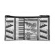 Black and white jazz themed cosmetic bag. This bag can also be used for pens and pencils. The original artwork was done in charcoal. The design has a variety of musical instruments including a clarinet, upright bass, old microphone, trumpet, piano, and a drumstick. Great little everyday bag for the jazz music lover, teacher, or student.