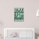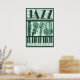 Dark green jazz music poster with a variety of musical instruments including a clarinet, upright bass, old microphone, trumpet, piano, and a drumstick. Great for the music lover, teacher, or student.