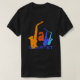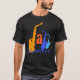 Colourful (orange and blue harmony) Saxophones as letters forming the word "Jazz" + word "Quartet" in blue. Design on black men shirt. Available without the word "Quartet", with the same design in black, in white, with all-over printed men shirt and with another design of saxophones with saxophonist as A letter.