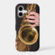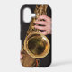 For music lovers! Protective and trendy phone case for the Apple iPhone and features a photo image of a jazzman playing his time-worn, gold colored, tenor saxophone horn. Select case for your iPhone model and select case style.