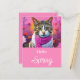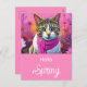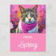 A vibrant spring postcard with whimsical artwork. Behold this charming tabby wearing a magenta scarf, posing outdoors in a meadow with wild flowers in the background.Embracing a jazzy vibe with a cheerful "Hello Spring" note.