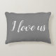"Je nous aime" dans un joli script sur un coussin d'accent confortable. La couleur de celui-ci est gris attrayant avec le script blanc, et nous l'avons dans beaucoup d'autres couleurs aussi. Découvrez les autres avec un clic de souris pour voir quelle touche de couleur serait le mieux pour ajouter ce message d'amour à votre décor maison. Cet exemple est mis en place avec une couverture en coton lavable, mais il est également facile de choisir d'autres choix de tissu avec des prix différents.