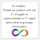 Cet autocollant est un moyen simple mais efficace de communiquer à d'autres que vous ou un proche êtes autiste et peut avoir besoin d'un soutien ou de mesures d'adaptation supplémentaires. Le message est clair et facile à lire, ce qui en fait un excellent outil pour les personnes autistes à utiliser dans une variété de situations, de l'école ou du travail à des événements sociaux. C'est un moyen parfait de sensibiliser à l'autisme et de promouvoir la compréhension et l'inclusion.