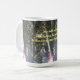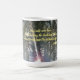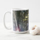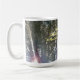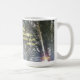 Une tasse inspirante avec une photo imprimée d'une belle lumière du soleil brillant entre les pins.