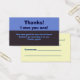 "Merci ! Je vous en dois une !" C'est ce que dit cette carte sur le devant, avec "Cette carte est bonne pour une faveur de retour. Réachetez en me le retournant. Merci encore !" Au verso vous pouvez écrire des informations plus spécifiques sur la faveur. Vous savez comment ça se passe ; quelqu'un vous rend un grand service, et vous dites "Merci, je vous en dois un," mais...ils n'y croient pas VRAIMENT. Avec cette carte, vous pouvez montrer que vous appréciez vraiment sincèrement ce qu'ils ont fait pour vous, et démontrer que vous avez VRAIMENT l'intention de les aider quand ils en ont besoin. Bien sûr, cette zone sur le dos où il dit "Commentaires" est un bon endroit pour écrire dans ce que vous NE FEREZ PAS pour eux haha ...par exemple peindre leur maison, ou plier la vérité pour les sortir d'un endroit serré ; vos limites sont à vous. C'est "un peu" juste pour s'amuser, mais encore une fois, comme je l'ai dit, parfois vous voulez que les gens ressentent vraiment l'impact de votre profonde dette de gratitude, et cela le fera d'une manière légère sans vous mettre mal à l'aise.
