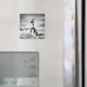 Fridge magnet with a moody black and white photo of a surfer crossing the reef to go and surf the amazing tubes at Jeffrey's Bay in South Africa.