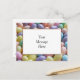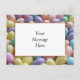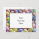 A close up of pastel coloured jelly beans in the background and a white box with a coral border awaits your personal message
