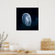 This design features a jellyfish floating with the underside of its umbrella shaped structure exposing its translucent organs brightly lit with a blue hue from above, close to the surface of the sea.