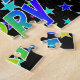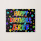 This vibrant, fun, birthday-themed jigsaw puzzle design has the message "HAPPY BIRTHDAY, JERRY" with the characters having a colourful rainbow spectrum inspired gradient pattern, in addition to a lively star field background pattern. A vibrant puzzle like this might be used to send birthday wishes to somebody named Jerry. [~Z0000468]