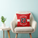 Jersey number, team and player name red and white sports throw pillow. It showcases the jersey number, the team and player names that can be changed on red background. There is a white and red band. Colours: red, white, black.