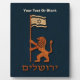 A digital "carved wood sign" depicting the lion emblem of the city of Jerusalem; and the lion is holding a flag of Israel. Hebrew text reading, "ירושלים" (Yerooshalayim - Jerusalem) appears below the lion. Add your own additional text.