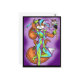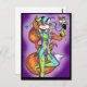 This postcard depicts a colourful fox dressed as a jester dancing.