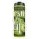 This image features the powerful declaration "Jesus is Life" in bold, white, ornate lettering with a vibrant neon green glow. The text stands out dramatically against a dark, monochromatic background depicting a serene forest scene with mountains and a body of water. The contrasting elements create a striking visual representation of spiritual vitality amidst a sombre landscape.