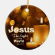This Christmas ornament features Bible verse John 8:12, Jesus the Light of the world. The background has warm lit candles and beautiful golden abstract lights. The back greeting, names and date can be modified to the details of your choice.