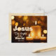 Beautiful scripture postcard features Bible verse John 8:12, Jesus the Light of the world. The background has warm lit candles and golden abstract lights. The back greeting can be personalized and used for many different occasions.