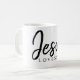 Jesus loves me with a tiny red heart on a cup.