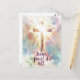 Easter postcard depicts a beautiful watercolor wooden cross with a blue, pink and white abstract background. It features the title to a Christian Hymn, "Jesus paid it all." The greeting, prayer can be personalized or deleted for a hand written message.