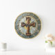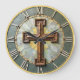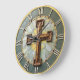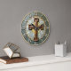 Elevate your home decor with a high-energy expression of faith using this rustic abstract wall clock. The central face features a high-definition graphic of a weathered, golden-brown cross set against a radiant sunburst and a muted sage-green background. While the artwork masterfully mimics the thick, heavy-stroke appearance of a palette-knife oil painting and the central cross looks like aged, hand-carved timber, this is a lightweight and durable graphic timepiece rather than actual wood or layered plaster. The bold, off-white Roman numerals are set against a distressed-style outer rim, providing a professional and polished contrast that makes the time easy to read. This timepiece serves as a sophisticated focal point for a living room, office, or prayer space, offering a meaningful self-gift for those who appreciate high-quality spiritual art with a modern, rustic aesthetic.