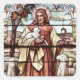 A vintage stained glass in multiple colours. Jesus stands with his staff holding a lamb as two other sheep look up at Him