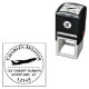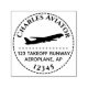 This self-inking stamp has a silhouette of a jet airplane flying. There is a dashed line below it and around the plane, forming a circle.