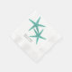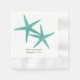 Serviettes en papier de couple bleu lagon pour une réception de mariage. Deux étoiles de mer et du texte noir sur des serviettes blanches ou écru.