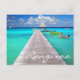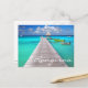 Postcard of a wooden jetty with some colourful boats and a thatched hut in the turquoise blue lagoon of the tropical, Pacific island Rangiroa, close to Tahiti and Bora Bora in French Polynesia with the text 'Rangiroa'.