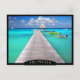 Postcard of a wooden jetty with some colourful boats and a thatched hut in the turquoise blue lagoon of the tropical, Pacific island Rangiroa, close to Tahiti and Bora Bora in French Polynesia with a black edge and in white the text 'Polynesia'.