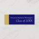 Les cartes de nom de diplôme sont un excellent choix pour distribuer à vos amis et associés de classe supérieure. Ils annoncent votre prochain diplôme et sont un moyen de partager votre événement spécial. Cette conception comprend un arrière - plan bleu royal avec une barre de couleur jaune or sur le côté, avec votre nom, l'année de remise des diplômes sur le devant, et trois lignes de texte sur le dos pour vos coordonnées comme les réseaux sociaux ou les numéros de téléphone portable.