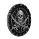 Crâne couleur Chrome et épées croisées. Pour le pirate discriminant. Veuillez noter qu'il s'agit d'une image, pas d'un vrai métal.