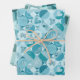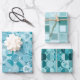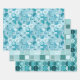 papier d'emballage ensemble de 3 feuilles avec différents designs, sircles, carrés, ornements, tons turquoises