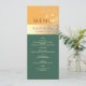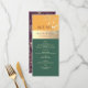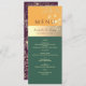 Simple, calligraphy, modern, elegant, jewel tones, emerald green, yellow and plum purple wedding menu with gilded gold floral lace.