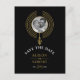 This magnificent and chic wedding Save theDate announcement postcard is an up-to-date design, with the couple's photo surrounded by concentric circles, reminiscent of a wire choker. The design is further adorned with a leaf ornament situated at the lower centre in gold.