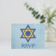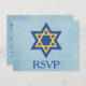 Send RSVP to your wedding with these lovely Jewish RSVP postcards. Displaying A Jewish theme, the star of David is featured in blue and gold. The back of the card features a blue background with information neatly placed. All font is in blue. Place your order today!