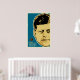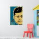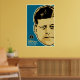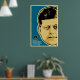 Features John F. Kennedy illustration over blue field.