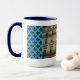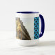 Joan of Arc statue in Paris France mug features a picture of the famous French saint as she sits astride her steed in her attempt to win the coronation of King Charles VII of France during the Hundred Years' War. Sides of the cup have a blue fleur de Lis pattern to complete the design.