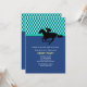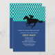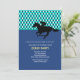 A sporty invitation that's perfect for a Kentucky Derby party or any horse-racing-related occasion. The card features a blue, green and white argyle pattern on top, a solid blue bottom and a silhouette jockey on a horse in black.