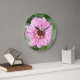 A photograph of a pink flower, with yellow star shaped flowers in the center. The clock face has purple numbers.