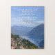 Focus on the wonderful news of God's love with this John 3:16 Christian Bible verse mountain and lake jigsaw puzzle. John 3:16 written in modern white typography says, "For God so loved the world that he gave his one and only Son, that whoever believes in him shall not perish but have eternal life." All the text is editable so you can add your favourite Bible verse or inspirational custom text. I took this photo of the Alps and mountain lake and European village in Switzerland. You can also replace my photograph with one of your own favourite photos for inspirational home decoration. This puzzle would be a great encouraging gift for a friend. It would be a fun creative way to bring the Word of God into your home.