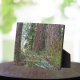 Plaque with hinge that features the photo image of a giant conifer forest of Douglas Fir trees along with inspiring words of a quote by naturalist John Muir that reads, "The clearest way into the Universe is through a forest wilderness."