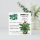 Garden party invitation featuring a cute potted plant with monarch butterfly and string lights. Join us is done in hunter green bubble lettering to attract attention. Fully customize all party information on the front of this invitation. On the reverse rests a potted plant with a ladybug and string lights on the potted plant.
