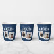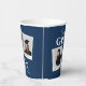Modern double graduation party paper cups, which features 2 photos of the graduate's. The cup has template text that reads 'CONGRATS GRAD'S, THEIR NAMES, YEAR OF GRADUATION, and THEIR SCHOOL OR COLLEGE NAME'.