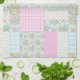 Un chic Serviette de cuisine ou Serviette de thé, avec un joli motif en faux patchwork nostalgique de Dogroses roses sur un arrière - plan bleu ciel avec pois, rayures et plaids assortis. Une partie de la collection Posh & Painterly 'Rosy Posy'.