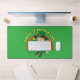 Tapis de bureau avec l'illustration d'un joli léprechaun souriant portant un costume vert, un chapeau haut en tenant une feuille de shamrock, avec un arc-en-ciel coloré dans l'arrière - plan et un texte disant "Bonne Saint Patrick" Un design parfait pour célébrer la Saint Patrick, dessiné par Radka2D