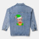 Un elfe de Noël moderne joyeux et mignon tenant une veste de boîte cadeau. Le texte peut être personnalisé.