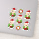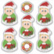 Ensemble de sept autocollants en vinyle coupé avec l'illustration d'un joli petit garçon souriant et joyeux aux cheveux blonds courts, habillé en vêtements de Noël et portant un casquette du Père Noël rouge, sur un arrière - plan vert; cinq autocollants du garçon et deux autocollants avec une couronne de Noël; avec un modèle texte personnalisable pour votre nom ou message