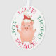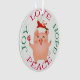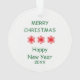 Ce joli ornement de Noël a une image d'un petit cochon rose qui danse habillé d'un chapeau de Père Noël rouge et blanc. Un petit oiseau perche sur le casquette, et le cochon tient un tourbillon de menthe poivrée. Le texte en rouge et vert autour du bord dit "Amour Espoir Paix Joy". Le dos de l'ornement a trois champs de texte personnalisés en vert et rouge, et des flocons de neige rouges comme diviseur. N'oubliez pas de sourire !