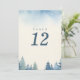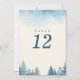 Cette carte numérique de table présente un design minimaliste mais élégant avec un grand numéro gras centré sur la carte. L'arrière - plan présente un paysage forestier d'aquarelle tranquille, avec des arbres à feuillage persistant dans des tons doux de bleu et vert encadrant le fond et les côtés. Le ciel subtil et brumeux au sommet ajoute à l'esthétique paisible, ce qui rend cette carte idéale pour les mariages et événements extérieurs, boisés ou rustiques. Son aménagement propre et moderne assure la mise en valeur du numéro de table tout en ajoutant une atmosphère naturelle et sereine.