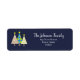 Étiquette unique, mignonne, bleu marine, adresse de retour de Noël avec pins colorés et script moderne.