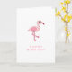 Une carte d'anniversaire mignonne et fantaisiste avec un vecteur illustrant un oiseau flamand rose. L'oeuvre est de style kawaii et a une allure girly et jolie. Le texte à l'avant de la carte dit "Joyeux anniversaire", un jeu de mots sur l'expression Joyeux anniversaire. Il y a un motif flamand à l'intérieur de la carte.