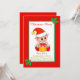 Un elfe de Noël mignon habillé en rouge invitation à la fête de Noël. Mignonne elfe bébé tenant un arrière - plan boîte cadeau. Le texte est prêt à être personnalisé.